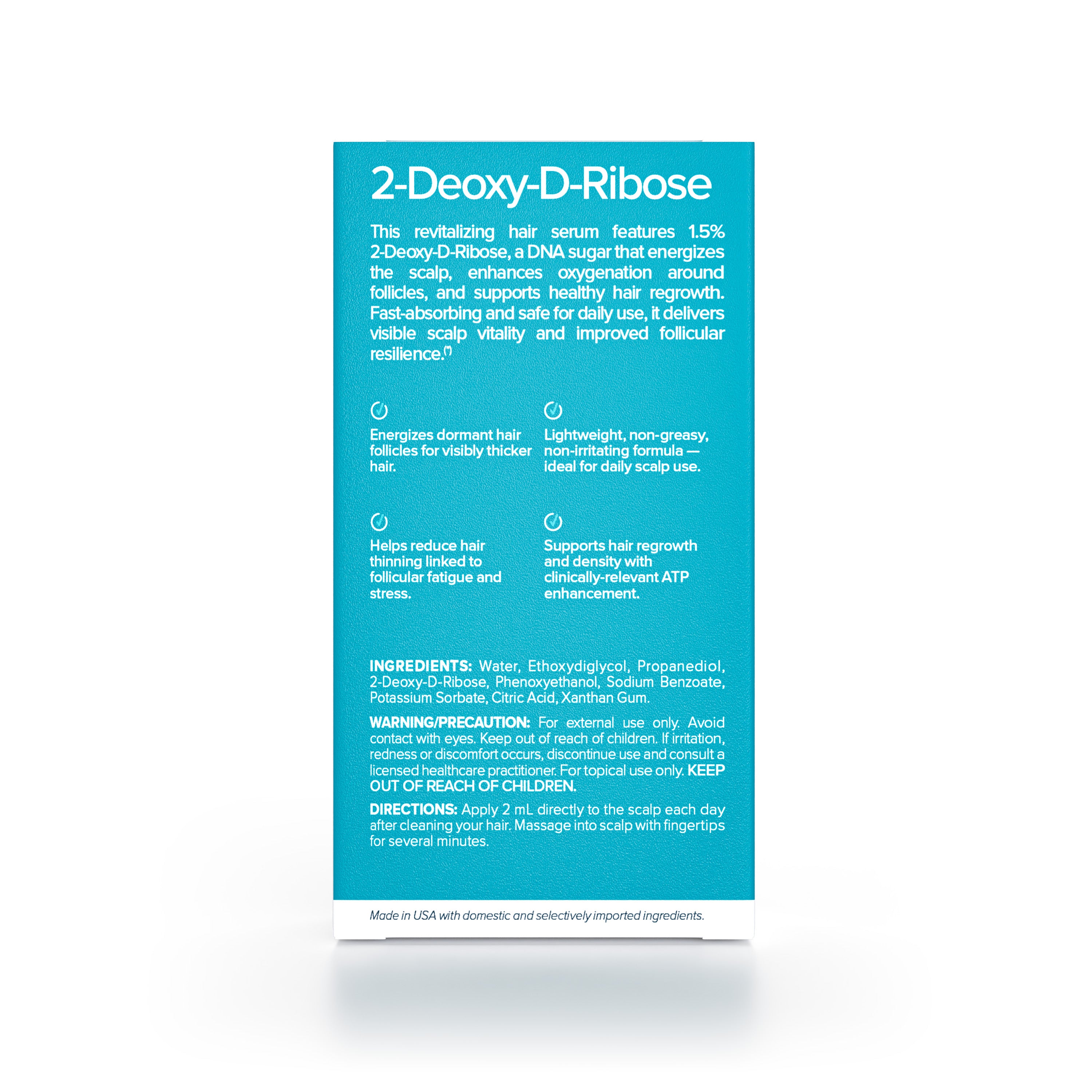2dDR on läpimurto kosmetiikka-aineosa, jota on tutkittu sen kyvystä tukea ATP-tuotantoa, energianlähdettä, joka auttaa pitämään päänahan ympäristön aktiivisena ja terveenä. Vaikka tarkka kosmetiikkamekanismi on vielä tutkimuksen kohteena, tutkimukset viittaavat siihen, että 2dDR voi auttaa stimuloimaan mikroverenkiertoa, virkistämään karvatupen aluetta ja ylläpitämään pitkäaikaista päänahan elinvoimaisuutta. Ajan myötä tämä uudistunut ympäristö auttaa hiuksia näyttämään vahvemmilta, täyteläisemmiltä ja näkyvästi kestävämmiltä.